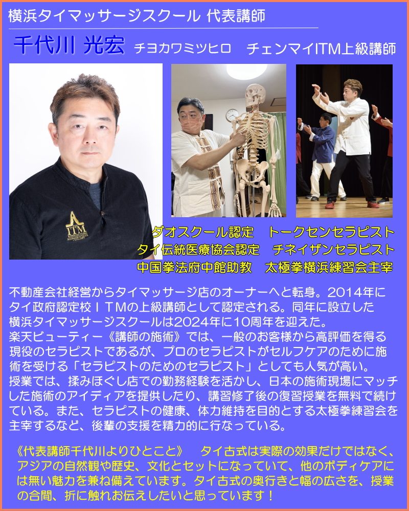 横浜タイマッサージスクールの代表講師は、日本で数多くのITM修了生を輩出した実績を本校ITMに認められました。また、チョンコール校長審査の下、施術の確かさを認められ、ITMカリキュラムの上級コースの授業を行なうことを認められた経験をもつ講師です。横浜でITMカリキュラムの基礎コースを修めた後、上級コースへ進学、さらにインストラクターになるためにタイ・チェンマイへ留学することが可能です。